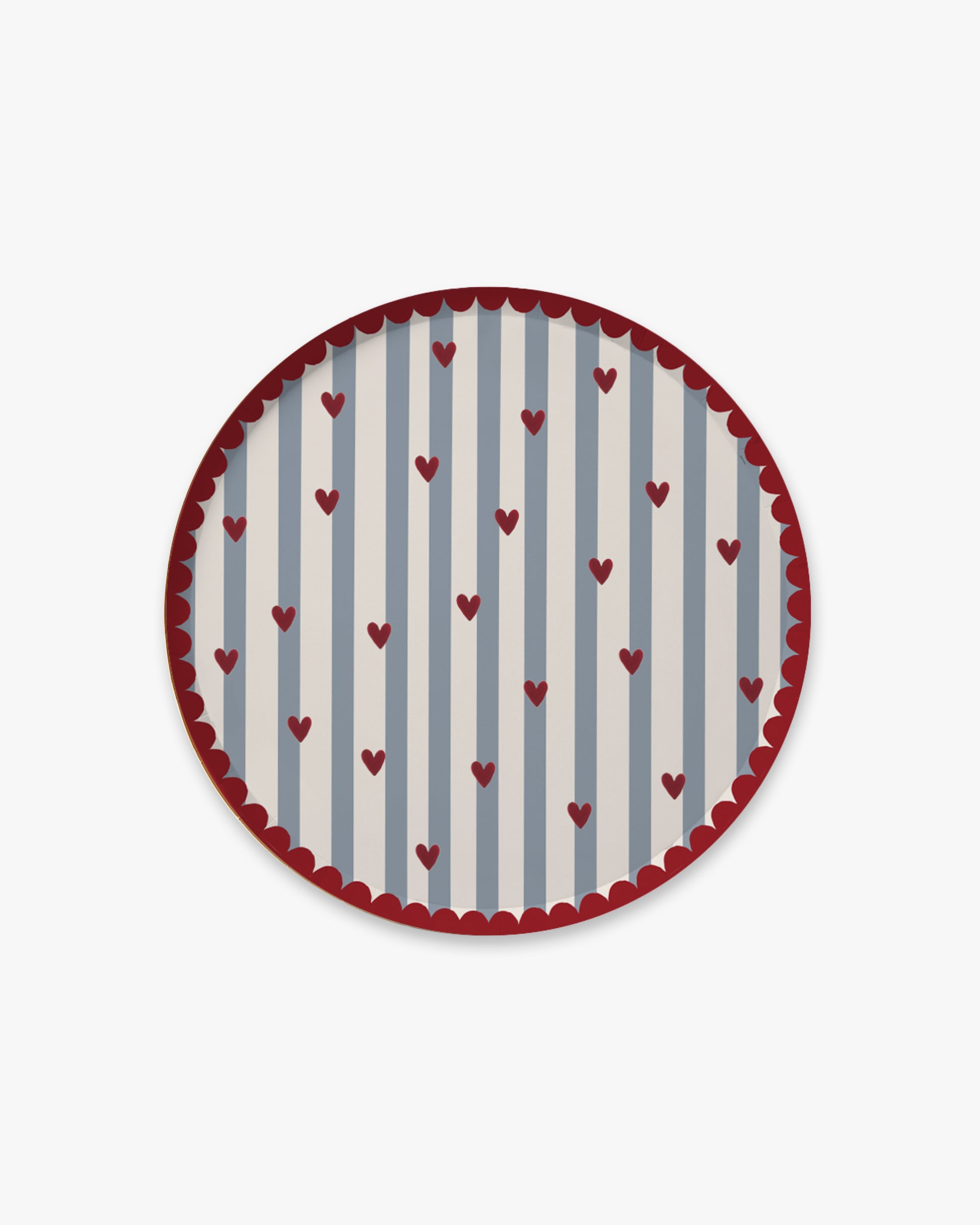 The Lover Appetizer Plate is designed to bring a sense of charm to the table while remaining effortlessly chic. It features soft slate stripes, scattered crimson hearts, and a scalloped edge that feels equal parts refined and romantic.